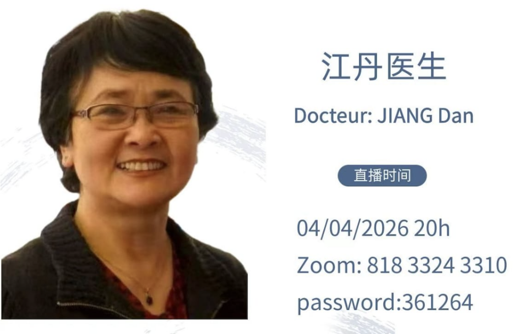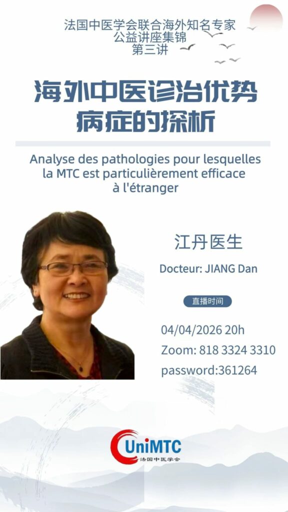 Nous aurons l’honneur de recevoir le Dr Jiang Dan médecin chinoise de renom exerçant au Royaume-Uni depuis plus de 30 ans. Vous trouverez ci-dessous son parcours ainsi qu’un résumé de la conférence et les informations de connexion. En espérant vous voir nombreux !